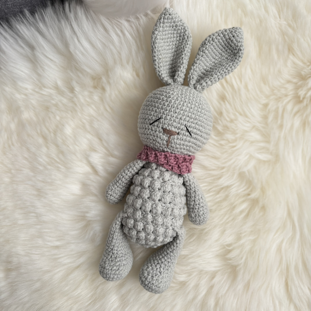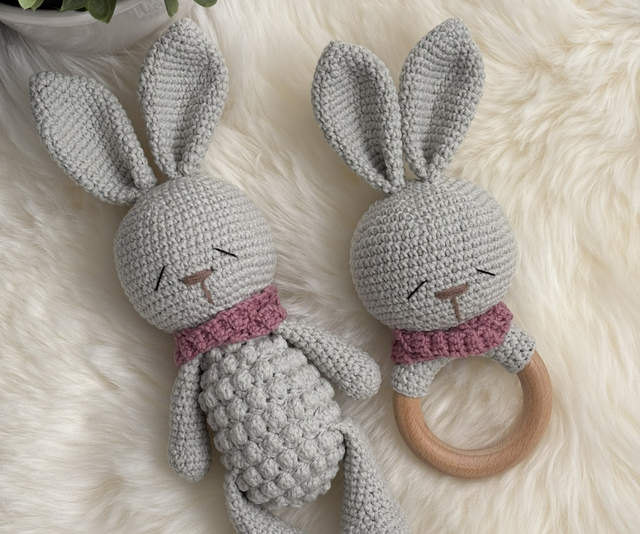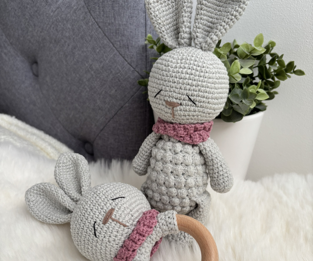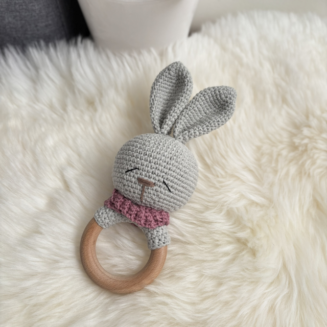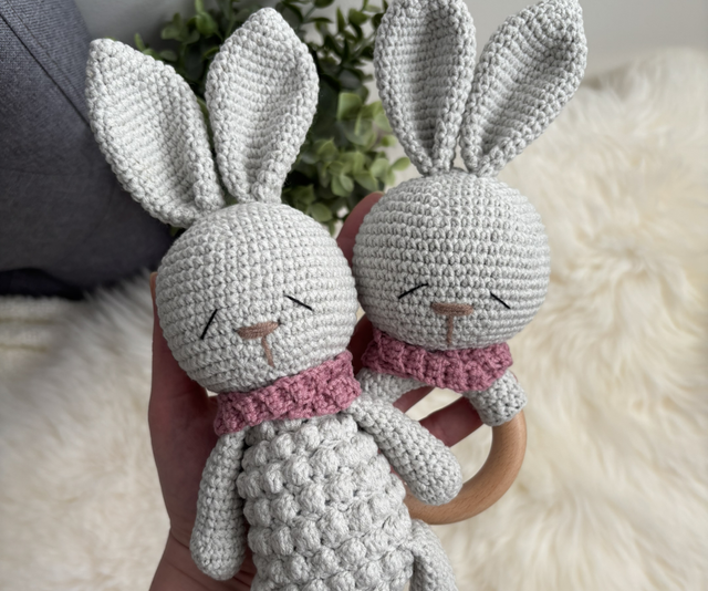 - Mesures: lapin 25cm environ, hochet 11cm environ.