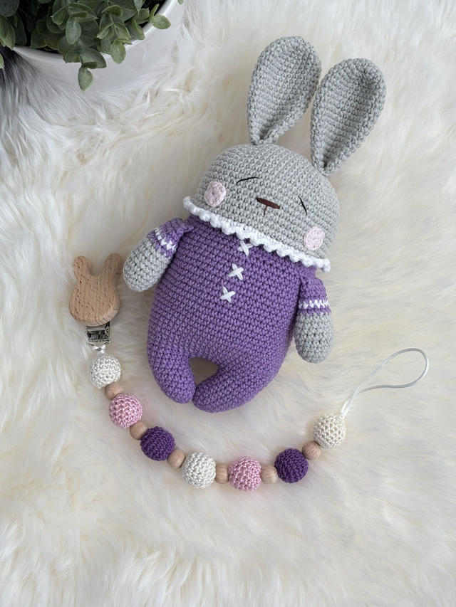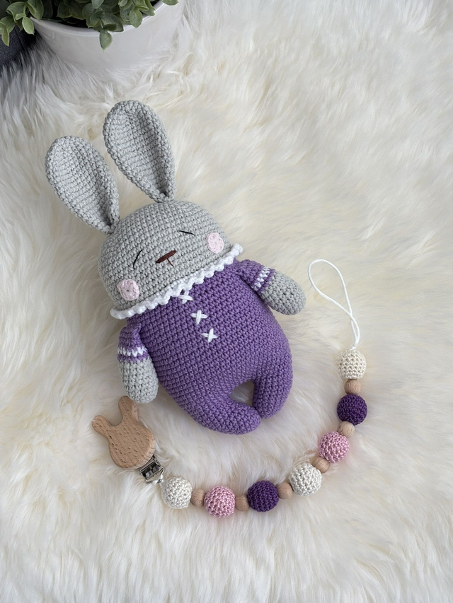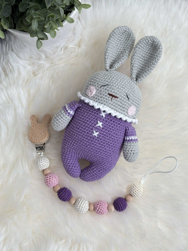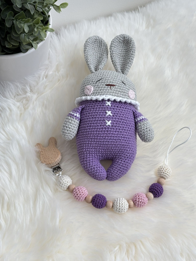 Doudou lapin avec une attache tétine fait main par mes soins.