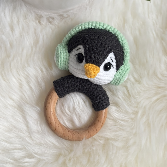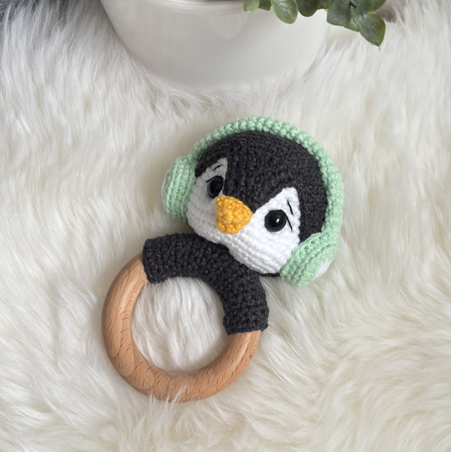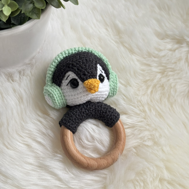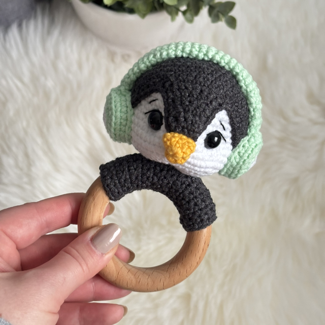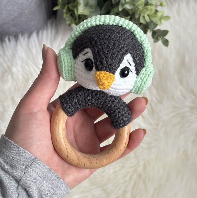 Hochet pingouin fait main avec soin.